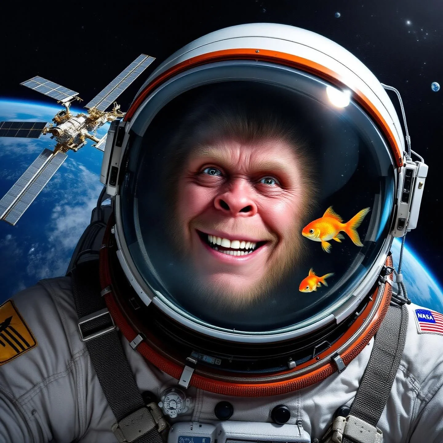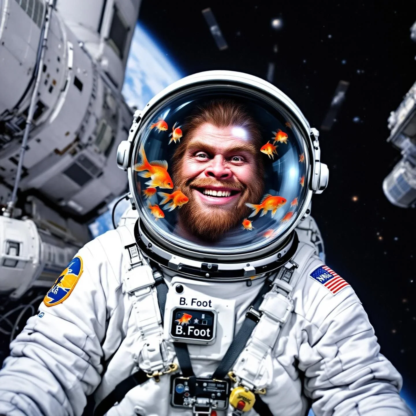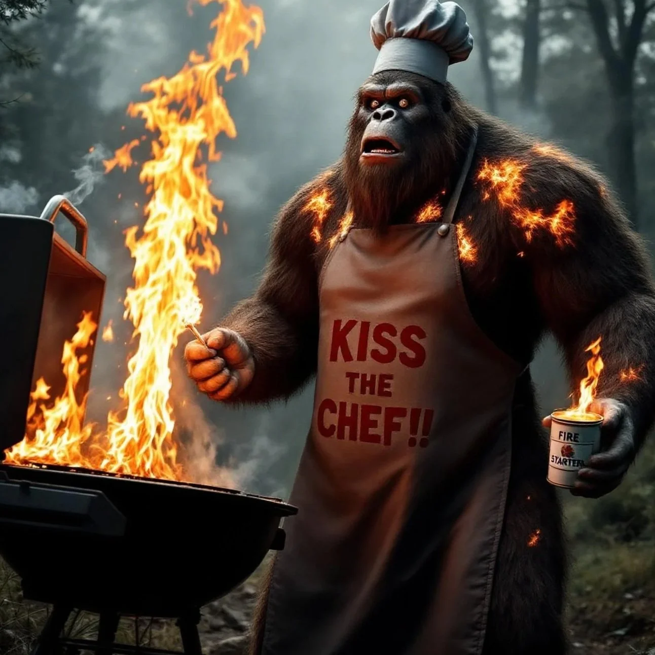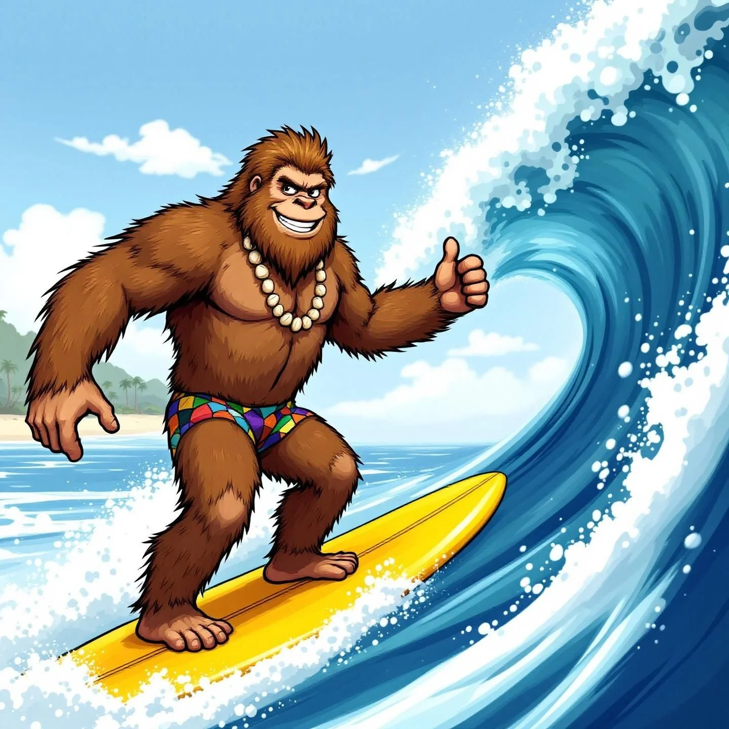 A cartoon Bigfoot wearing colorful shorts and a shell necklace surfing on a yellow surfboard on the ocean waves with a beach and tropical trees in the background.